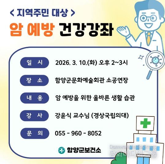 이번 건강강좌는 지역주민의 건강증진과 암 예방 인식 향상을 위해 마련됐으며, 암의 주요 발생 원인과 예방을 위한 올바른 생활습관의 중요성 등을 중심으로 진행될 예정이다.