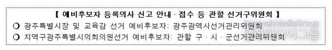 또한, 「공직선거법」 제53조 제1항에 따른 공무원 등은 3월 5일까지 사직해야 공직선거에 입후보가 가능하나, 광주특별시 시장 및 교육감 선거에 입후보하려는 공무원 등은 특별법에 따라 3월 15일까지 사직하면 입후보가 가능하다.