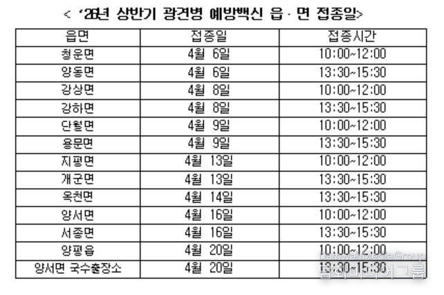 접종은 관내 지정 동물 병원 △우람동물병원 △양평가축병원 △중앙동물병원 △참좋은동물병원 △토마스동물병원 △개포동물병원 △용문동물병원 △용문조아동물병원 △동물병원산책 △강남동물병원 △이장석동물병원 등 11곳과 읍면별 순회 접종 장소에서 받을 수 있다. 반려동물과 함께 방문해 접종하거나 수의사 처방전을 발급받아 접종하는 방법 등이 있으며, 희망자는 마리당 1만 원의 접종 시술비 또는 처방전 발급비를 부담해야 한다.