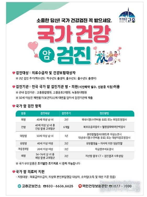 국가암검진 및 의료비 지원에 관한 자세한 사항은 고흥군 보건소 지역보건팀으로 문의하면 안내받을 수 있다.