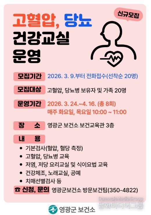 시민행정신문 강갑수 기자 | 영광군보건소는 만성질환 예방과 군민 건강수명 연장을 위해'2026년 상반기 고혈압·당뇨병 건강교실'참여자 20명을 선착순 모집한다고 밝혔다.