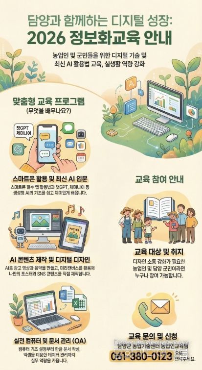 시민행정신문 이세훈 기자 | 담양군은 지역 농업인의 디지털 소통 능력을 키우고 스마트한 농촌 환경을 조성하기 위해 ‘2026년 농업인 정보화 교육’을 추진한다.