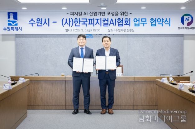 시민행정신문 이세훈 기자 | 수원특례시와 (사)한국피지컬에이아이(AI)협회는 6일 시청 상황실에서 업무협약을 체결하고, 피지컬 인공지능(AI) 산업 활성화를 위해 적극적으로 협력하기로 했다.