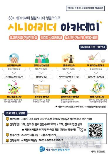 시민행정신문 강갑수 기자 | 시흥시노인종합복지관은 천주교수원교구의 지원을 받아 베이비부머 세대를 위한 전문자격 양성과정 ‘시니어리더 아카데미’를 오는 4월부터 운영하는 가운데, 참가 어르신을 모집한다.
