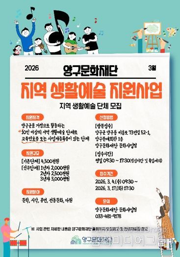 시민행정신문 기자 | 양구문화재단은 군민 중심의 생활문화 영역을 확대하고 지역 생활예술단체의 지속적인 창작 활동 기반을 마련하기 위해 ‘2026 지역 생활예술 지원사업’ 참여 단체를 모집한다.