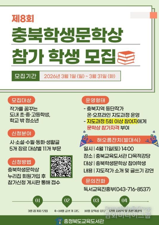 노재경 교육도서관장은 “충북학생문학상을 통해 학생들이 자신의 생각과 감정을 글로 표현하며 창작의 즐거움을 경험하고, 미래 문학 인재로 성장하는 계기가 되길 바란다.”라고 밝혔다.