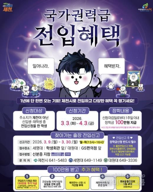 시 관계자는 “대학생 주소이전 사업이 제천시 인구 증가의 변곡점이 될 수 있도록 적극적으로 추진할 계획”이라며 “주소이전 장학금 외에도 전입 지원금 지급, 제천 투어의 날 운영 등 다양한 혜택을 통해 전입 대학생들이 지역에 애착을 가질 수 있도록 노력하겠다”라고 말했다.
