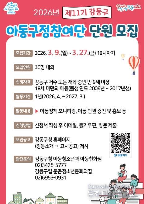 시민행정신문 강갑수 기자 | 서울 강동구는 3월 9일부터 27일까지 아동정책 모니터링과 아동 권리 증진 활동을 이끌어갈 ‘제11기 강동구 아동구정참여단’을 모집한다고 9일 밝혔다.