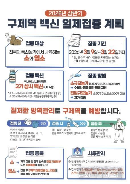시민행정신문 강갑수 기자 | 홍천군은 구제역 유입 방지와 완전 차단을 위해 상반기 구제역 일제 백신접종을 실시한다. 대상은 1,001 농가 36,830두(소 928 농가 33,566두, 염소 73 농가 3,264두) 사육 농가이다.