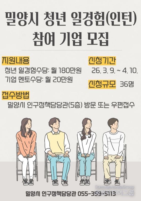 시민행정신문 강갑수 기자 | 경남 밀양시는 청년들에게 양질의 일경험을 제공하고 지역 기업의 인력난을 해소하기 위한 ‘2026년 청년 일경험(인턴) 지원사업’에 참여할 기업을 오는 4월 10일까지 모집한다.