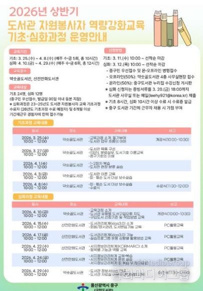 시민행정신문 강갑수 기자 | 울산 중구가 도서관 운영을 활성화하고 자원봉사 문화를 확산하기 위해 ‘2026년 상반기 도서관 자원봉사자 역량 강화 교육’을 운영한다.