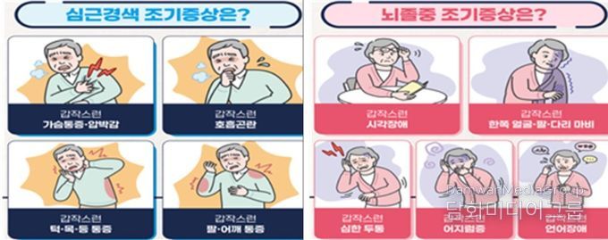 시는 심근경색 및 뇌졸중의 조기증상을 숙지하고, 의심 증상이 발생할 경우 지체 없이 119에 신고해 신속하게 전문 치료를 받을 것을 당부했다.