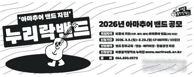 시민행정신문 강갑수 기자 | 세종시문화관광재단은 오는 3월 23일까지 ‘2026년 누리락밴드’ 사업에 참여할 지역 아마추어 밴드를 모집한다.