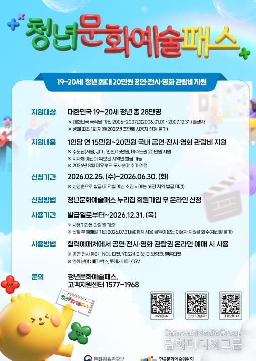 신청은 ‘청년문화예술패스’ 공식 누리집을 통해 가능하며, 대상자로 선정되면 지원 금액 범위 내에서 공연, 전시, 영화 등 다양한 문화예술 콘텐츠를 이용할 수 있다.