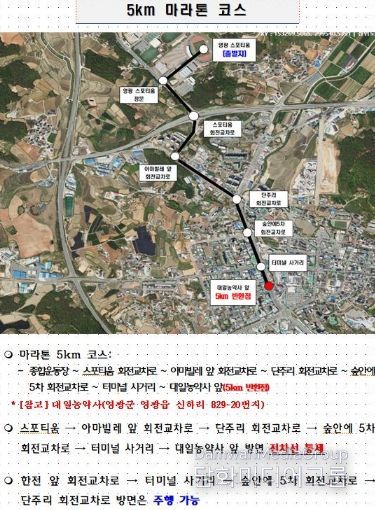 국도 22호선의 법성·홍농방면 신평교차로부터 전면통제에 따른 10km, Half 코스 우회구간은 신평교차로 – 만곡사거리 – 논산보건진료소 – 장산리 회전교차로 – 원불교 영산성지 – 국민여가캠핑장 – 법성포 방면으로 안내할 계획이다.