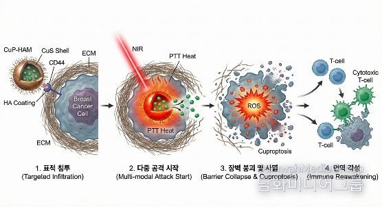 연구팀은 이 견고한 장벽을 허물기 위해 나노공학과 종양면역학을 융합한 '핵-껍질(Core-Shell) 구조의 구리-나노플랫폼'을 독창적으로 설계했다.