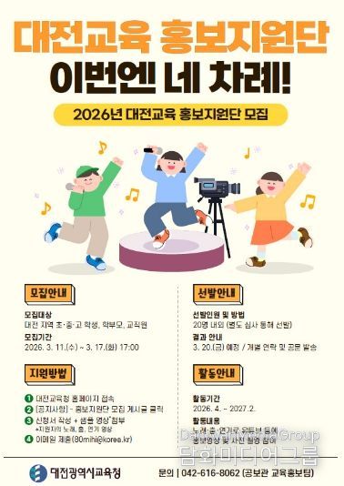 시민행정신문 기자 | 대전시교육청은 교육가족이 직접 참여하는 홍보 콘텐츠 제작을 위해 3월 11일부터 17일까지 ‘2026년 대전교육청 홍보지원단’을 공개 모집한다고 밝혔다.