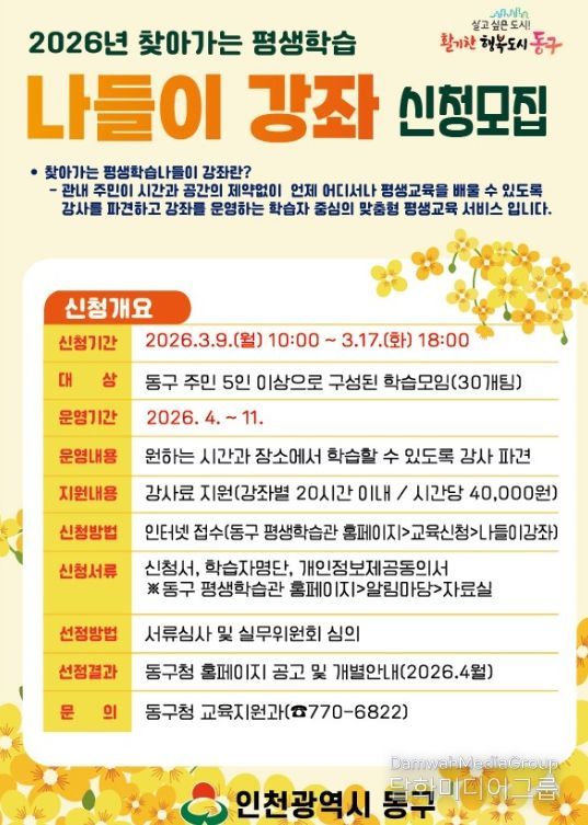 시민행정신문 강갑수 기자 | 인천 동구는 구민의 평생학습 참여 확대를 위해 오는 17일까지‘2026년 찾아가는 평생학습 나들이 강좌’신청 접수를 받는다고 밝혔다.