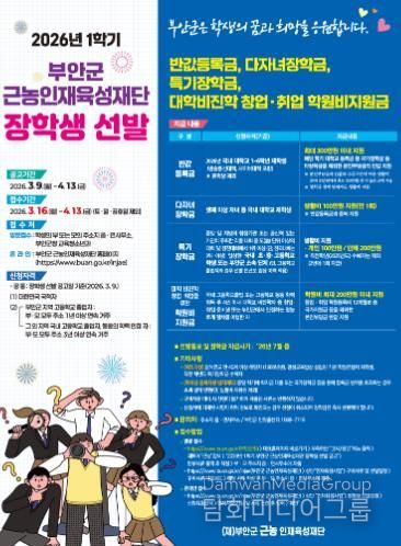 시민행정신문 강갑수 기자 | 부안군 근농인재육성재단은 2026년 1학기 장학생 신청 접수를 위해 각종 홍보자료를 준비하고 온라인 신청 시스템을 정비하는 등 장학생 선발 준비를 모두 마쳤다고 전했다.
