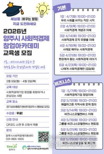 시민행정신문 이세훈 기자 | 양주시와 양주시사회적경제지원센터가 지역 내 사회적경제 인식을 확산하고, 사회적경제 교육을 통한 예비 창업가ㆍ사회적경제 분야 인력양성을 하기 위해 ‘2026년 양주시 사회적경제 창업아카데미 기본ㆍ비즈니스 과정’ 교육생을 오는 4월 9일까지 모집한다.