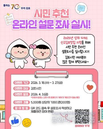 아울러 설문에 참여한 시민 중 총 300명을 무작위로 추첨해 5천원 상당의 기프티콘을 제공하며, 당첨자는 4월 3일 김포시청 홈페이지를 통해 발표될 예정이다.