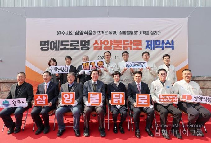 시민행정신문 강갑수 기자 | 원주시는 지난 11일 우산동 삼양식품 원주공장 인근에서 원주시 제1호 명예도로명인 ‘삼양불닭로’ 제막식을 열었다. 이날 행사에는 원강수 시장과 김정수 삼양식품 부회장, 김동찬 삼양식품 대표 등 관계자 30여 명이 참석했다.