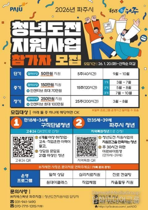 파주시 관계자는 “청년도전 지원사업은 단순한 취업 알선을 넘어 청년들의 자신감 회복과 사회 적응을 돕는 단계별 맞춤형 프로그램”이라며 “취업의 문턱에서 어려움을 겪고 있는 청년들이 다시 도전할 수 있도록 적극 지원하겠다”라고 말했다.