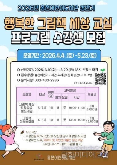 홍천군 관계자는 “북스타트 책놀이는 영유아가 자연스럽게 책과 가까워지고 보호자와 함께 즐거운 독서 경험을 쌓을 수 있도록 돕는 프로그램”이라며, “관심 있는 군민 여러분의 많은 참여를 바란다”라고 말했다.