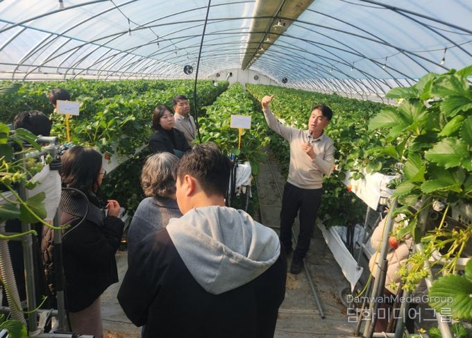 이어 논산시 부적면 소재 딸기 재배농가를 방문해 LED 보광등과 다단재배 시설이 적용된 재배 현장을 직접 견학했다.