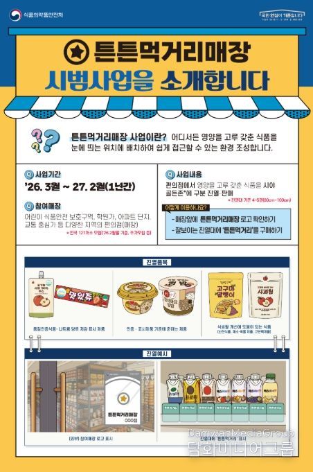 올해는 시범 사업(2026년 3월~2027년 2월)을 통해 식약처-지방정부-편의점 업계가 협력하여, 현재 121개 매장을 시작으로 연내 300개 매장 이상으로 확대하고 ‘튼튼먹거리 구매인증 이벤트’를 통해 소비자 홍보도 강화할 예정이다.