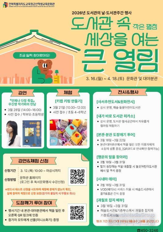 시민행정신문 강갑수 기자 | 군산학생교육문화관은 다가오는 도서관의 날(4.12)을 맞아 지역 내 독서문화 확산을 위해 3월 말까지 도서관 주간 행사를 운영한다.