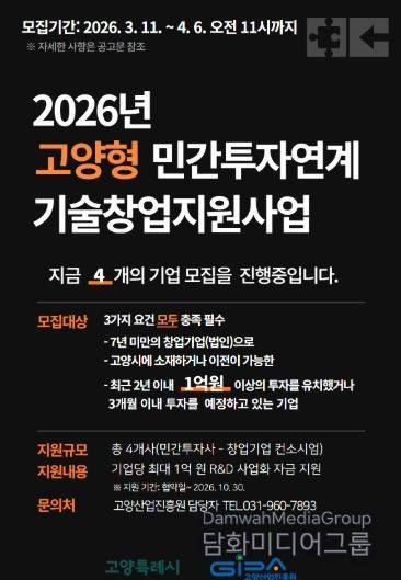 시민행정신문 이세훈 기자 | 고양산업진흥원이 유망 기술창업기업의 투자 유치와 기술 고도화를 지원하기 위한 ‘2026년 고양형 민간투자연계 기술창업지원사업’에 참여할 창업기업을 모집한다.