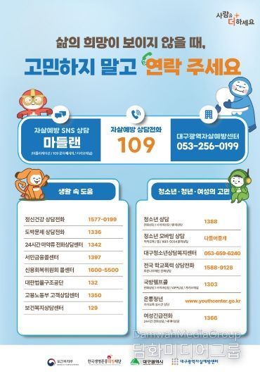 이재홍 대구광역시 보건복지국장은 “자살 예방은 지역사회 구성원 모두의 관심과 참여가 무엇보다 중요하다”며 “앞으로도 시민들이 위기 상황에서 신속하게 도움을 받을 수 있도록 상담과 지원 서비스를 지속적으로 강화해 나가겠다”고 말했다.