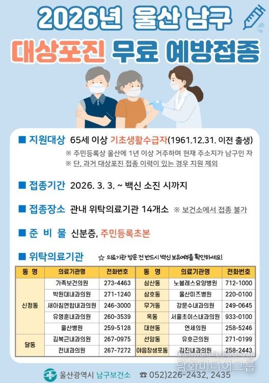예방접종 지원 대상자는 접종일 기준 남구에 주소를 두고 울산에서 1년 이상 거주한 65세 이상 기초생활수급자로 지원 백신은 대상포진 생백신이다.