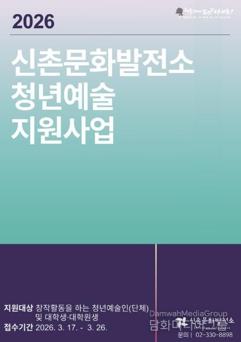 구는 ‘2026 신촌문화발전소 청년예술 지원사업’에 참여할 청년예술가 및 예비예술가를 이달 17일부터 26일 오후 6시까지 공개 모집한다.