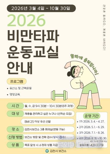 이번 프로그램은 총 4기로 운영되며, 기수별 20명씩 선착순 모집한다. 수업은 3월 4일 1기를 시작으로 10월 30일 4기까지 진행되며, 보건소 3층 회의실에서 매주 월·수·금요일 오전 9시 30분부터 10시 30분까지 운영된다. 참가 신청은 김천시보건소 방문 또는 전화(054-421-2719)로 가능하다.