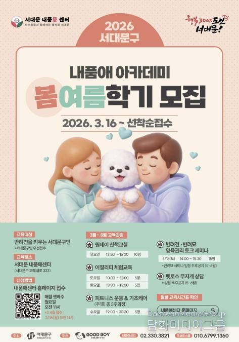 시민행정신문 강갑수 기자 | 서대문구가 이달부터 올 12월까지 관내 반려인과 주민을 위한 반려문화 교육 프로그램 '2026 내품애아카데미’를 서대문 내품애(愛)센터(모래내로 333)에서 운영한다고 13일 밝혔다.