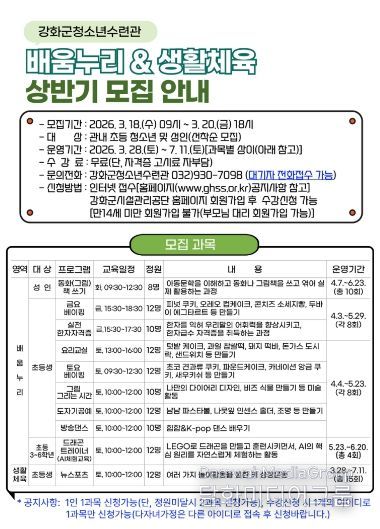 시민행정신문 강갑수 기자 | 강화군청소년수련관이 오는 18일~20일까지 상반기 배움누리&생활체육 프로그램 참가자를 모집한다.