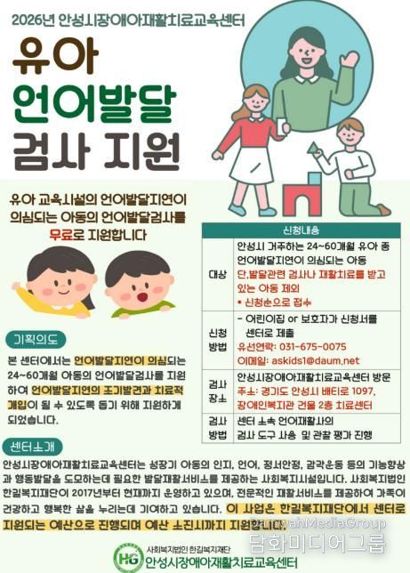 시민행정신문 강갑수 기자 | 안성시장애아재활치료교육센터가 지역 내 언어발달 지연이 의심되는 유아를 대상으로 조기 발견과 적기 치료를 돕기 위한 ‘무료 언어발달검사’를 지원한다.