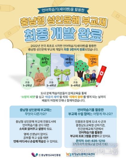 황환택 원장은 “충남형 성인문해 부교재가 성인 학습자들에게 실질적인 도움이 되길 바란다”며 “앞으로도 다양한 기술을 활용한 문해교육 모델을 개발해 누구나 배움에서 소외되지 않는 평생학습 환경을 조성하겠다”고 밝혔다.