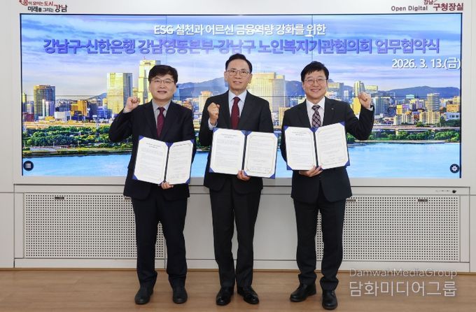 시민행정신문 강갑수 기자 | 꿈이 모이는 도시, 미래를 그리는 강남구가 13일 구청에서 ㈜신한은행 강남영동본부, 강남구 노인복지기관협의회와 3자 업무협약을 체결하고 어르신 금융역량 강화 교육을 추진한다. 이번 협약은 디지털 금융환경 변화에 따른 어르신들의 금융 소외를 예방하고, 보이스피싱 등 금융사고로부터 안전한 일상을 지원하기 위해 마련됐다.