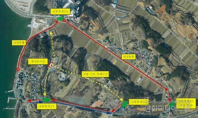 전면통제 구간은 선진공원 내 도로(선진마을 입구, 체리블라썸, 조명군총)이고, 일방통행 구간은 선진마을 주차장 → 스카이나마리나 회전교차로이다.