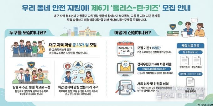 모집 기간은 3월 11일부터 25일까지이며, 대구시 내 초·중·고 학생을 대상으로 중·고등학생으로 구성된 ‘폴리스-틴’ 8개 팀과 초등학교 6학년으로 구성된 ‘폴리스-키즈’ 5개 팀을 모집한다.