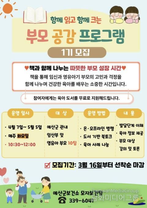시민행정신문 기자 | 예산군보건소는 임신부와 영유아 부모의 건강한 양육 역량 강화를 위해 ‘함께 읽고 함께 크는 부모공감 프로그램’ 1기 참여자를 16일부터 모집한다고 밝혔다.