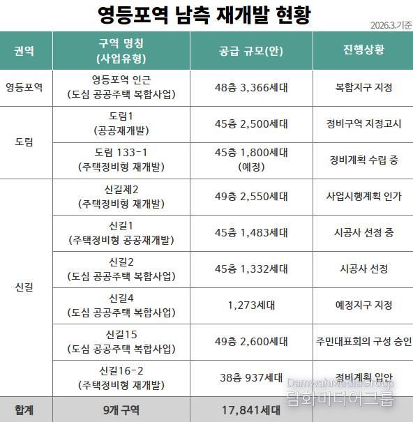 최호권 영등포구청장은 “영등포역 남측 일대의 변화는 낙후된 도시 이미지를 벗고 서울의 미래를 상징하는 명품 주거지로 거듭나는 과정”이라며 “1만 8천 세대의 대규모 정비사업이 차질 없이 진행될 수 있도록 모든 행정력을 집중하겠다”라고 전했다.