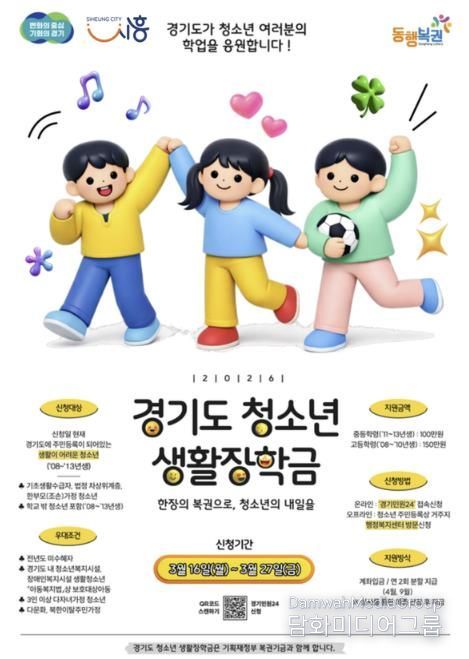 시민행정신문 강갑수 기자 | 시흥시는 경제적 어려움을 겪는 청소년들이 안정적으로 학업을 이어갈 수 있도록 지원하는 ‘청소년 생활장학금’ 대상자를 3월 16일부터 27일까지 모집한다.