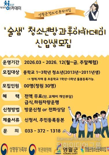 시민행정신문 강갑수 기자 | 영월군 주천면에 위치한 영월군청소년문화의집이 ‘술샘’ 청소년방과후아카데미에 참여할 청소년을 모집한다.