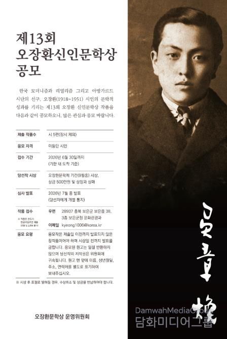 시민행정신문 강갑수 기자 | 충북 보은군과 오장환 문학상 운영위원회는 한국 모더니즘과 리얼리즘, 아방가르드 시단의 선구자로 평가받는 오장환(1918~1951) 시인의 문학 정신을 기리고 유망한 신인 시인을 발굴하기 위해 ‘제13회 오장환 신인문학상’ 작품을 공모한다.