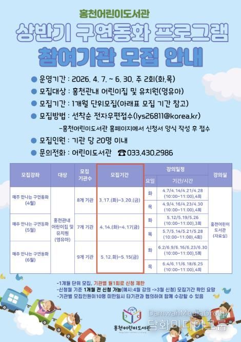 시민행정신문 강갑수 기자 | 홍천군은 영유아에게 그림책을 통해 정서적 안정 및 사회성 향상에 도움을 주며 책과 도서관을 가까이할 기회 제공을 위한 2026년 상반기 홍천 어린이도서관 '매주 만나는 구연동화' 프로그램 참여기관을 모집한다.