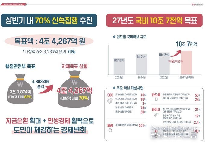 시민행정신문 강갑수 기자 | 강원특별자치도는 민생경제 활력을 위해 상반기 내 신속집행 대상 예산액의 70%인 4조 4,267억 원을 집행하고 2027년도 국비는 10조 7,000억 원 확보를 함께 추진해 나갈 계획을 밝혔다.